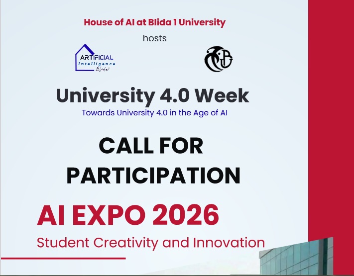 دعوة للمشاركة في معرض الذكاء الاصطناعي – جامعة البليدة 1 في ظل الإهتمام المتزايد بتعزيز الإبتكار وتطوير مهارات الطلبة في مجالات التكنولوجيا الحديثة، وخاصة الذكاء الإصطناعي، يسرّنا إعلامكم أنه وضمن فعاليات أسبوع الجامعة 4.0، تنظم جامعة البليدة 1، ممثلة في دار الذكاء الإصطناعي وتحت إشراف نيابة مديرية الجامعة للبيداغوجيا، معرض بعنوان: “إبداع وابتكار الطلبة”، يهدف هذا الحدث إلى إبراز جهود الطلبة وتثمين أعمالهم، إضافة إلى توفير منصة علمية لعرض مشاريعهم وتبادل الخبرات فيما بينهم وذلك يوم 16 أفريل 2026. كما نطلب من سيادتكم المساهمة في دعم هذه المبادرة العلمية من خلال تعميم هذه الدعوة على أوسع نطاق بين الطلبة في جامعاتكم، ومشاركتها مع زملائكم، لما لذلك من أثر كبير في تشجيع الطلبة على المشاركة وتحفيز روح الإبداع لديهم. كما نودّ التنويه إلى أن هذه التظاهرة ترحّب أيضًا بالمشاريع المنجزة مسبقًا أو التي تمّت مناقشتها (في اطار التحضير لشهادة ماستر أو مشاريع السنة الثالثة ليسانس) ذات الصلة بالذكاء الاصطناعي.